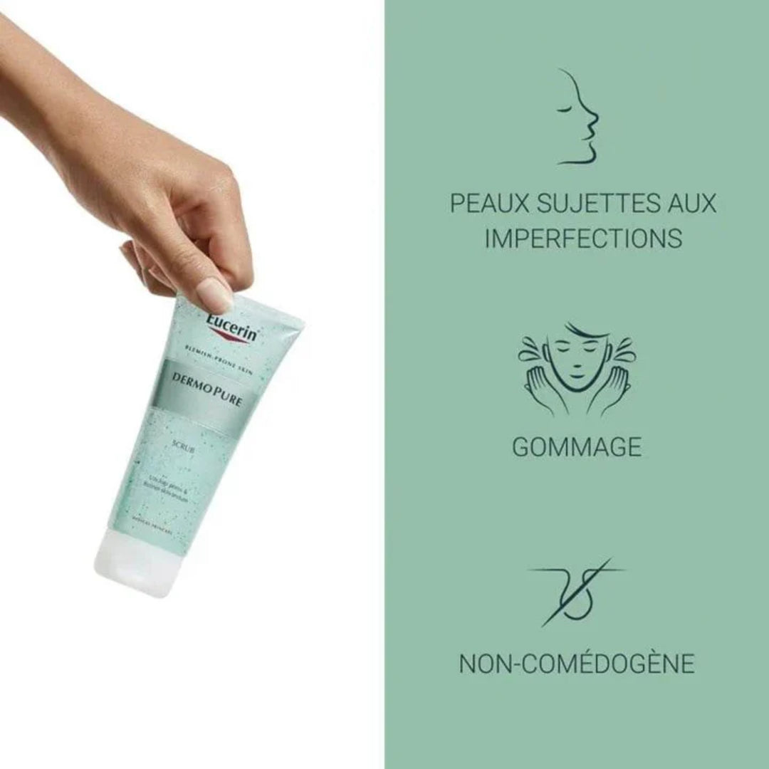 Le gommage EUCERIN DermoPure, idéal pour une utilisation quotidienne, contient des ingrédients doux et sans savon pour un nettoyage en profondeur.