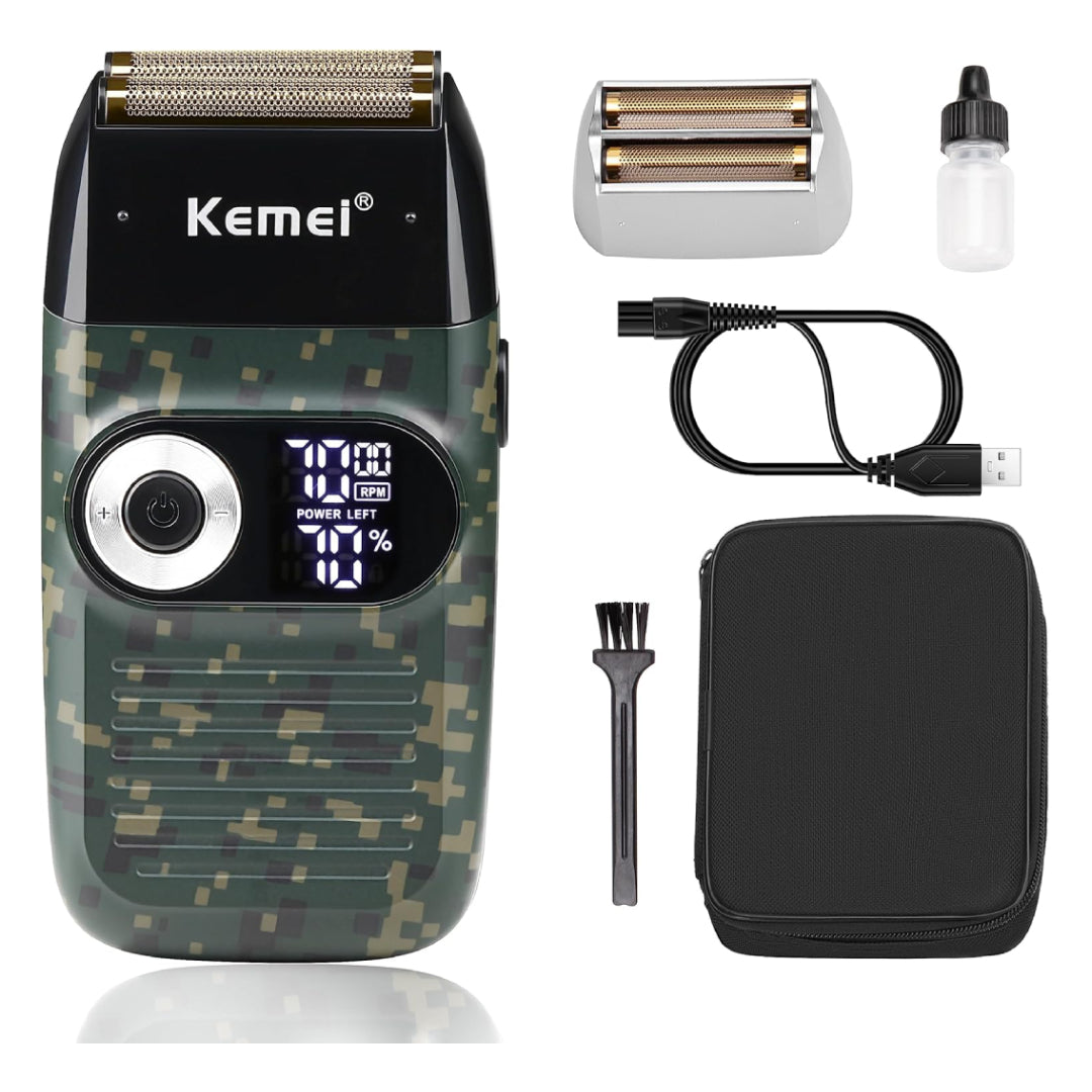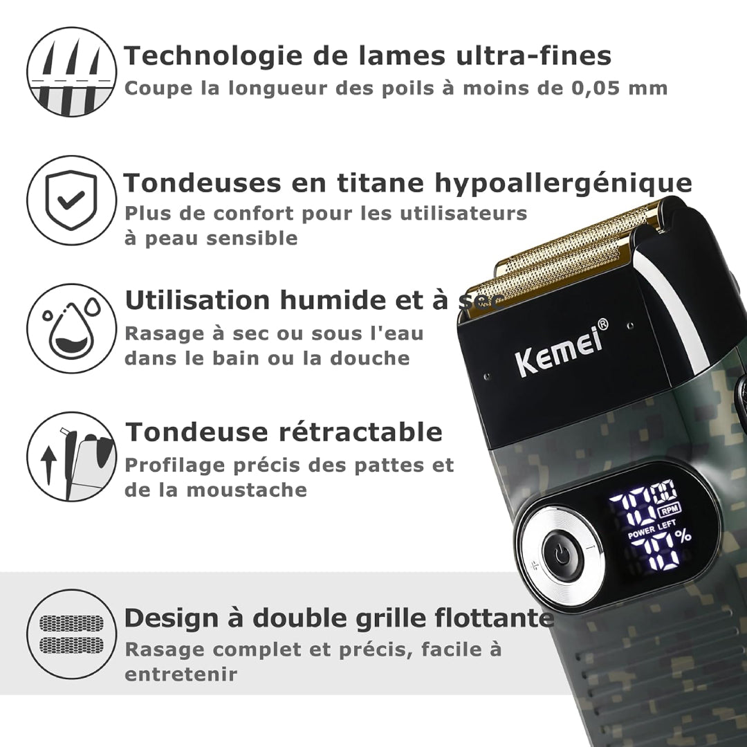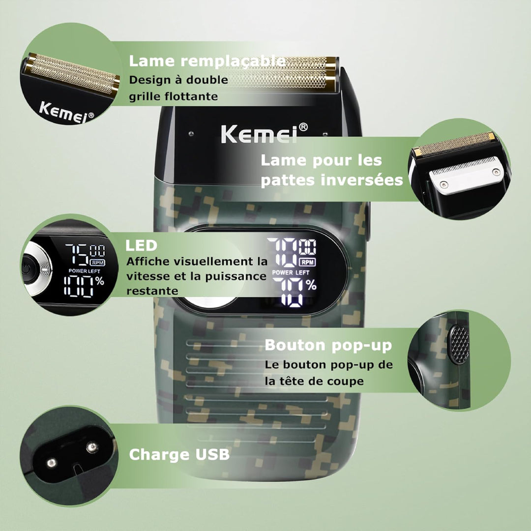Le rasoir électrique Kemei KM-2027 combine performance et design unique grâce à son look camouflage élégant. Doté de lames doubles décalées et d’un moteur rotatif puissant, il garantit un rasage précis et rapide. Son écran LCD affiche en temps réel le niveau de batterie et la puissance, pour une utilisation maîtrisée. Rechargeable via USB et offrant jusqu’à 2 heures d’autonomie, le KM-2027 est idéal pour un usage quotidien ou professionnel.