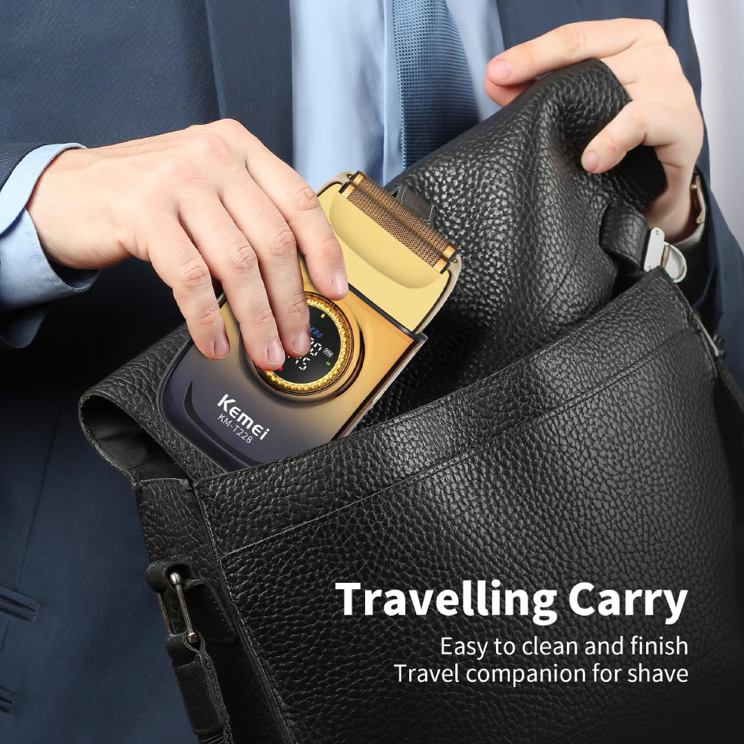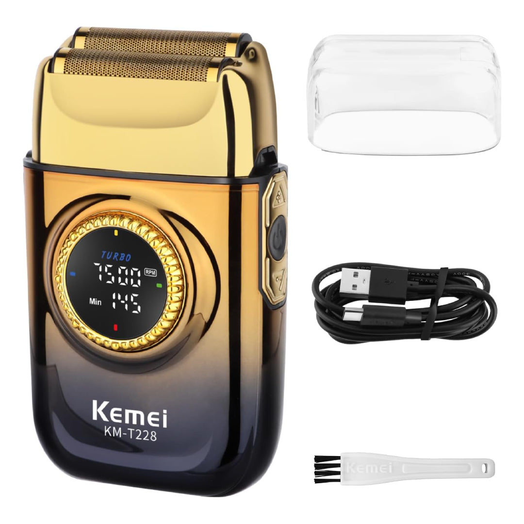 Le Kemei KM-T228 est un Rasoir électrique professionnel pour hommes, rechargeable, doté d'un moteur puissant (7500RPM), de 3 vitesses, d'un double jeu de têtes flottantes, d'un écran LCD et d'une fonction de charge rapide USB , idéal pour un rasage de près à sec ou humide, avec une conception métallique durable et une portabilité pour les voyages.