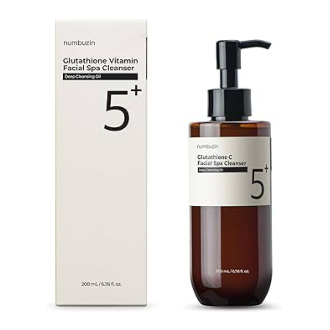 NUMBUZIN No.5 Glutathione C Facial Spa Cleanser 5+ 200 ML Une huile démaquillante riche en huiles naturelles (jojoba, olive, tournesol) qui élimine les impuretés, le maquillage waterproof, l'excès de sébum et les points noirs, tout en nourrissant la peau. Enrichi en glutathion, vitamine C et niacinamide, il aide à unifier le teint, réduit l'hyperpigmentation, les taches et marques d'acné. Sans parfum ni colorants artificiels, il offre une action douce mais efficace. Convient à tous les types de peaux, même sensibles ou acnéiques.